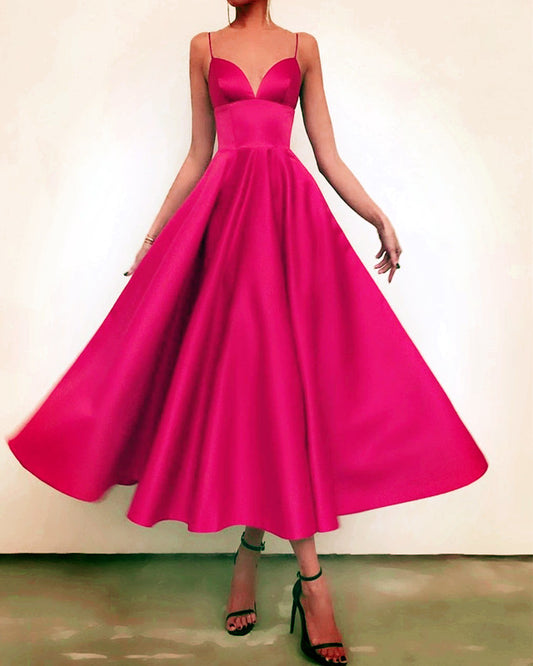 Tea Length Bridesmaid Dresses Satin V Neck Spaghetti Straps