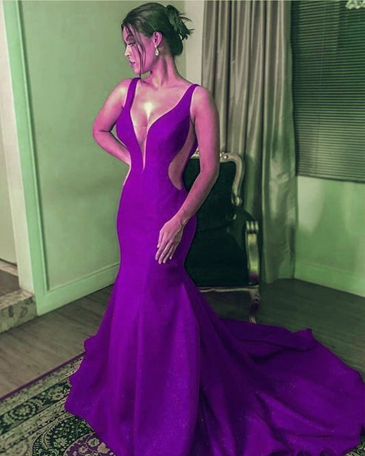 Simple Prom Dresses Mermaid Satin Plunge Neck