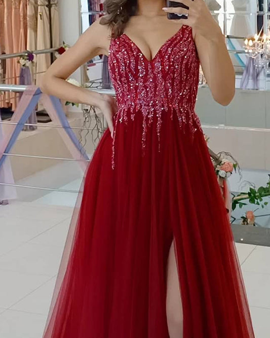 Tulle V Neck Prom Long Dresses Sequins Beaded Leg Split