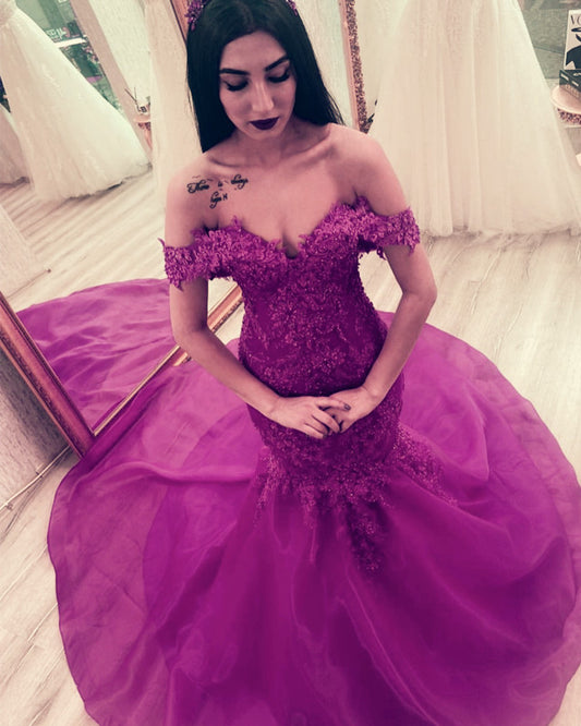 Mermaid Lace Beaded Prom Dresses Tulle Court Train