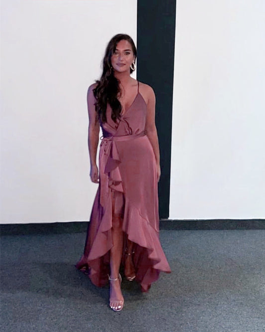 Split Ruffles V Neck Bridesmaid Dresses Spaghetti Straps