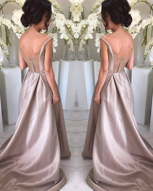 Long Taupe Satin Bridesmaid Dresses V Neck Open Back