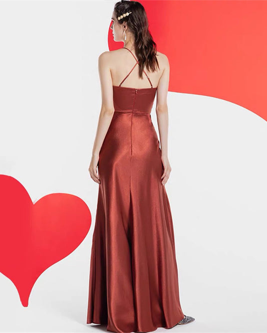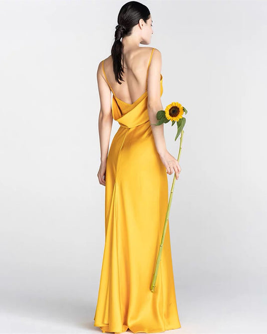 Long Gold Satin Fitted Bridesmaid Dresses Side Split