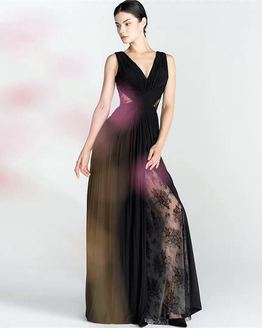 Sheer Lace Back Prom Dresses Chiffon Pleated