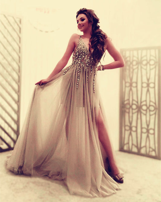 Tulle V Neck Split Prom Dresses With Sequins Beaded