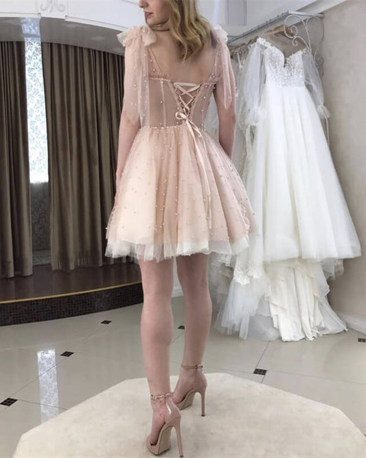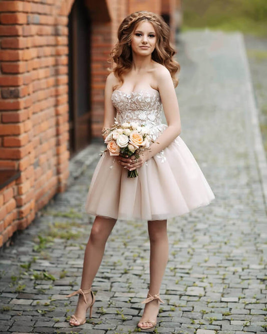 Champagne Tulle Homecoming Dress Lace Embroidery Sweetheart