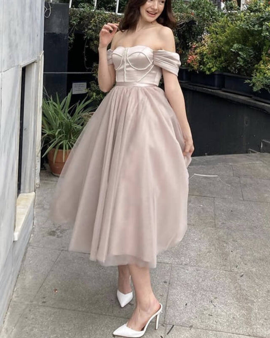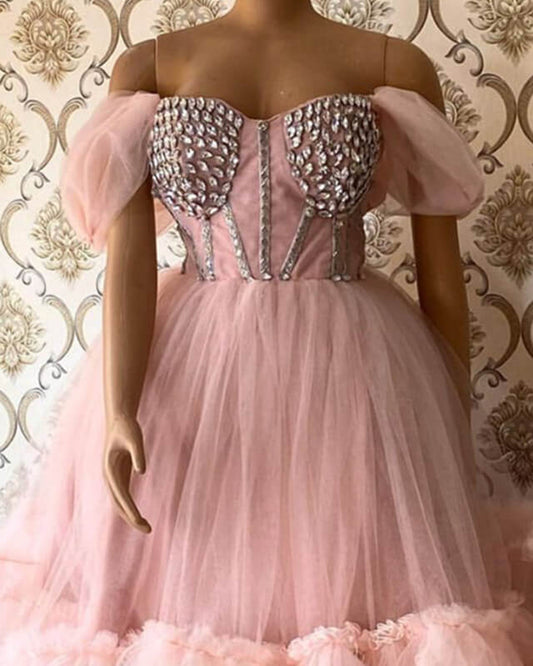 Pink Tulle Beaded Corset Off The Shoulder Midi Dress