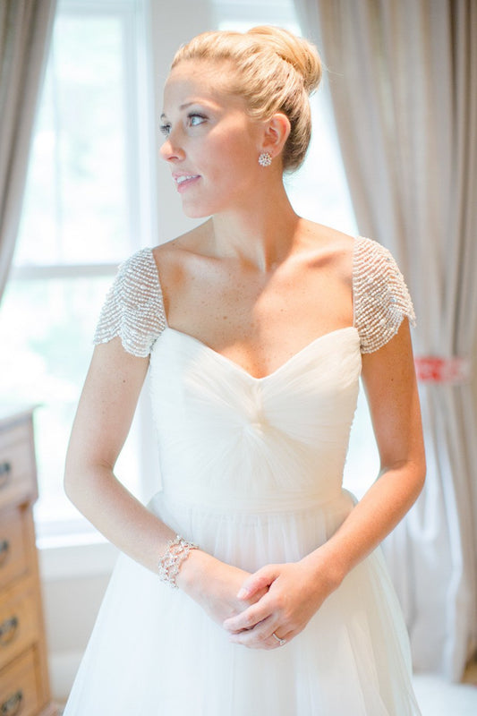 Rustic Style Long Chiffon Beach Wedding Dresses With Pearl Beading Cap Sleeves