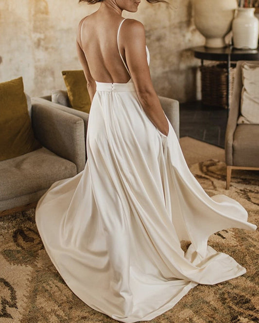 Boho Style Wedding Dresses Satin V Neck Front Slit