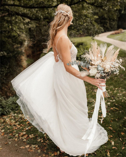 Romantic Tulle Boho Wedding Dress Lace V Neck
